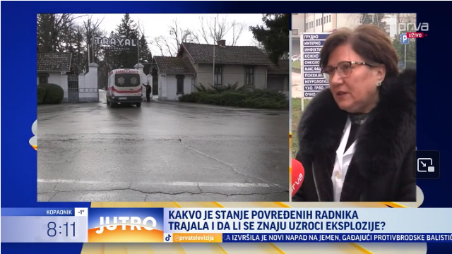 "Nakon jučerašnjeg nemilog događaja koji se desio u korporaciji Trajal, mi smo hospitalizovali četiri osobe zbog težine povreda. Jednu osobu smo bili prinuđeni da pošaljemo na dalje lečenje u tercirnu ustanovu na Vojnomedicinsku akademiju. Tri osobe su hospitalizovane kod nas na kliničkom praćenju, za sada su dobrog opšteg stanja, povrede su karakteristične za taj udarni talas, odnosno Blast sindrom", rekla je direktorka bolnice dr. Vesna Stević Gajić. Gospođo Gajić.
