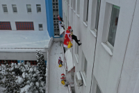 Pripadnici Gorske službe spasavanja, obučeni kako Deda Mrazovi, spustili su se sa krova zgrade Dečije klinike i doneli mališanima novogodišnje poklone, u akciji koju tradicionalno organizuje kompanija "Fazi" već sedam godina.
