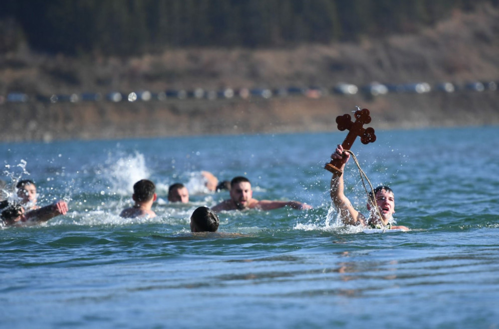 Posle Svete liturgije u Hramu rođenja presvete Bogorodice u Sremskoj Kamenici, u plivanju za Časni krst u hladnoj vodi Dunava učestvovalo je 100 plivača.