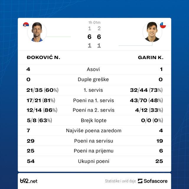 Sve je od početka meča išlo kako je želeo Đoković - odmah je došao do brejka, a kako je Čileanac previše grešio, Novak je veoma brzo dolazio do poena i gemova.