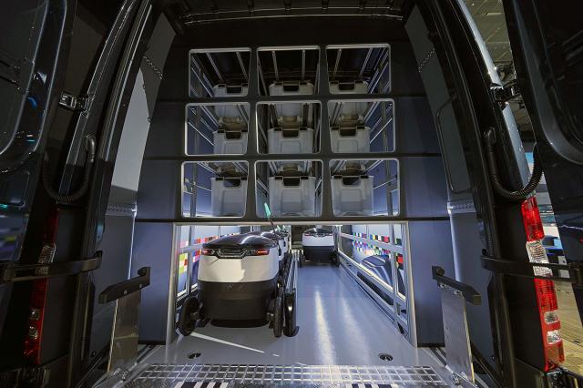 Četvrta varijanta je takođe potpuno automatizovana. Pre svega, unutrašnjost tovarnog prostora dostavnog vozila je konfigurisana tako da vertikalno postavljene police potpuno automatski utovaruje i istovaruje viljuškar-robot.
