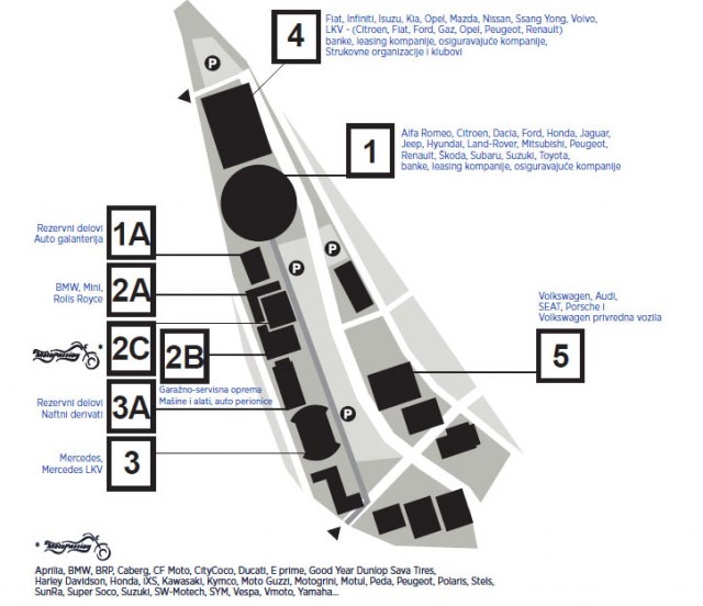 Proizvođači rezervnih delova i auto-galanterije tradicionalno su zastupljeni u hali 1A, firme koje se bave garaćno-servisnom opremom, mašinama i alatima, kao i opremom za auto-perionice, izlažu u hali 2B, dok su naftne kompanije i dobavljači rezervnih delova zastupljeni u hali 3A.