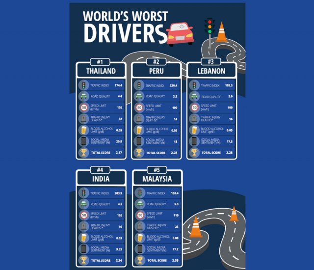 Sa druge strane spektra, Tajland je proglašen zemljom sa najgorim vozačima na svetu, sa daleko najvećim brojem tragičnih smrtnih slučajeva u saobraćaju, 32 na 100.000 ljudi.
