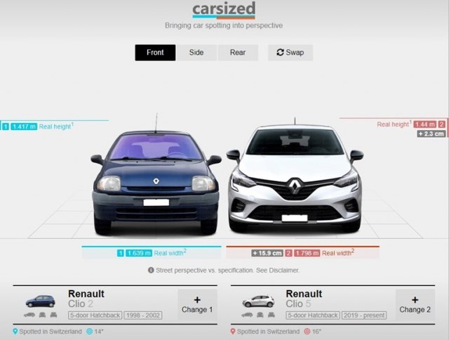 To je još očiglednije kada se upoređuju generacije popularnog potkompaktnog modela Renault Clio. Aktuelni model je sustigao nekadašnji Megane, pa je čak 16 cm širi i 28 cm duži od druge generacije.