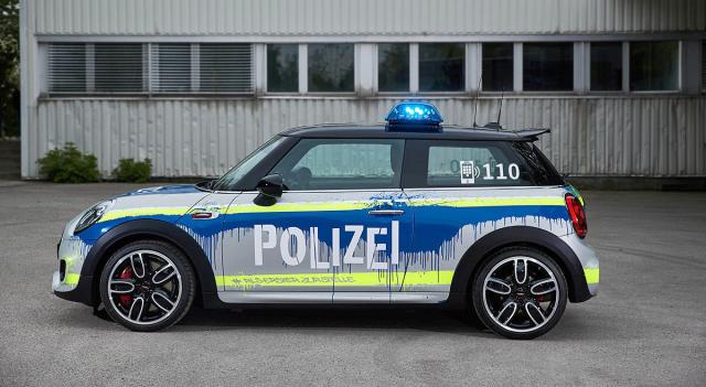 Najsnažniji serijski MINI preuređen je u patrolno policijsko vozilo – spoljašnjost je ofarbana na modernistički način u boje karakteristične za nemačke policijske automobile, a vozilo je opremljeno audio-vizuelnom signalizacijom.
