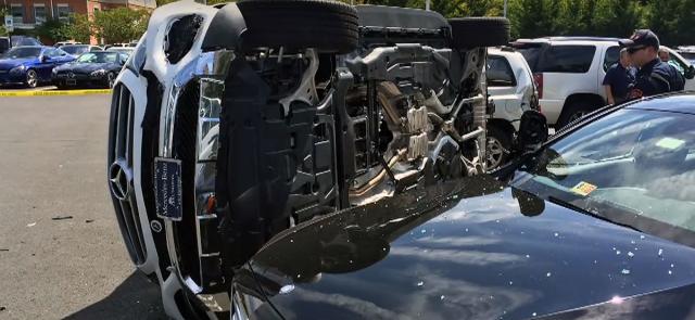 Probna vožnja novog Mercedesa GLE 350 ispred jednog salona automobila u SAD završila se nakon svega nekoliko sekundi prevrtanjem test vozila i štetom na još pet parkiranih automobila.