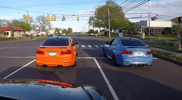 Javne saobraćajnice nisu trkališta, ali pojedini vlasnici moćnih mašina na četiri točka često se prave da to ne znaju. Tipičan primer su ova dva vozača BMW-a M3, koji su se – slučajno ili ne – našli jedan pored drugog na semaforu ispred jedne raskrsnice u SAD.
