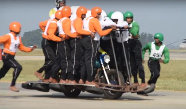 Ipak, treba naglasiti da to nisu obični ljudi, već pripadnici kaskaderske grupe Tornado sačinjene od momaka iz indijske vojske, koji izvodi razne akrobacije na dvotočkašima. Ovog puta odlučili su da postave novi Ginisov svetski rekord u broju ljudi koji se voze na jednom jedinom motociklu.