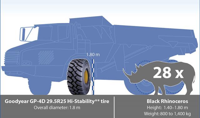 Kako primećuje proizvođač, između GP-4D pneumatika i crnog nosoroga iz afričkih savana može da se pronađe nekoliko sličnosti. Guma je, naime, visoka 1,8 metara, koliko je u ramenom delu visok i odrasli crni nosorog.