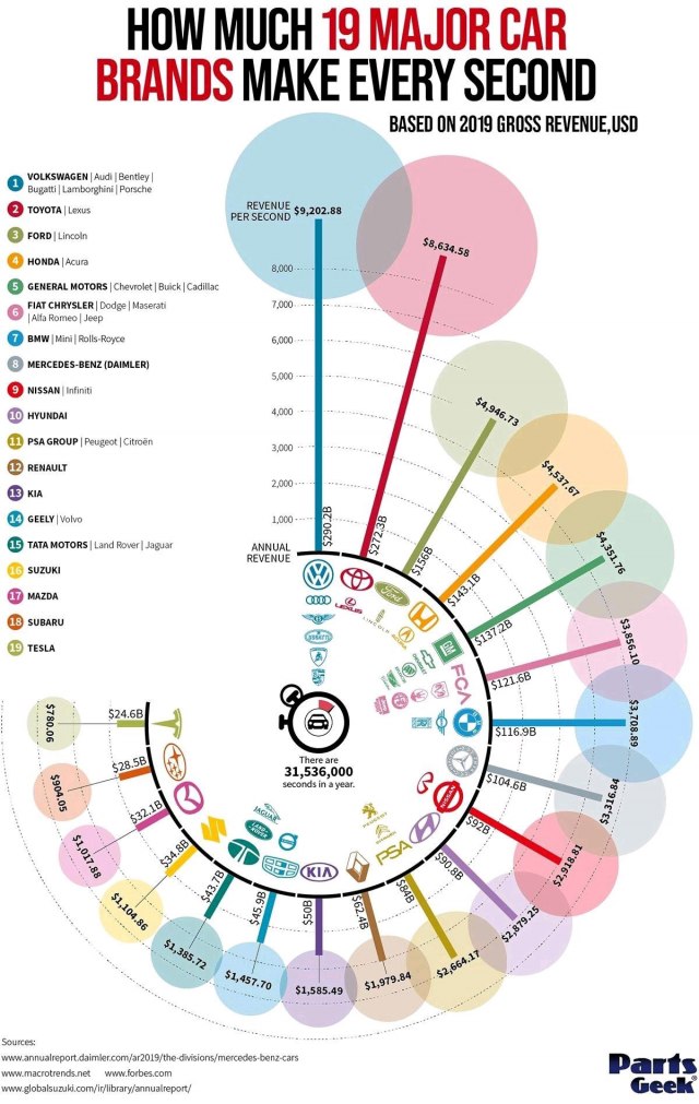 Zanimljivo je videti kolika je zarada najvećih auto-kompanija po sekundi. Tako je Volkswagen svake sekunde tokom 2019. godine zaradio 9.202,88 dolara, pokazuje analiza koju je objavio Parts Geek.