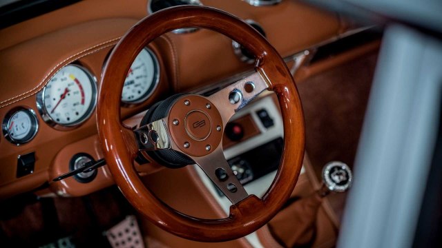 Volan je takođe u retro stilu i izrađen je od drveta.