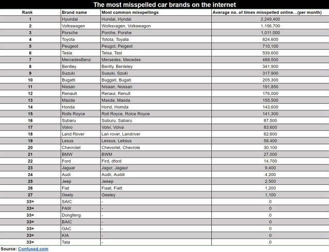 Prva tri proizvođača automobila sa najvećim brojem pogrešno napisanih su Hyundai sa 2.249.400 grešaka mesečno, Volkswagen sa 1.156.700 i Porsche sa 1.011.000.