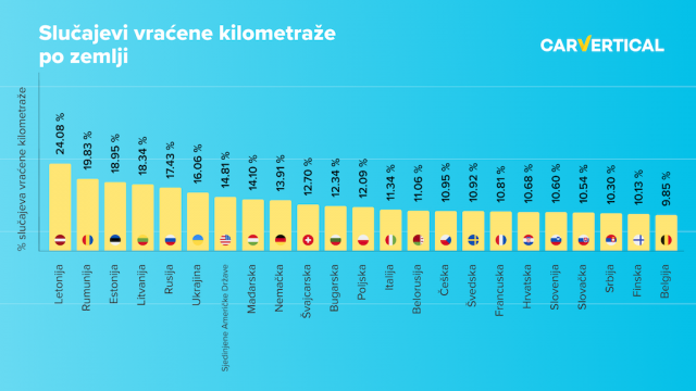 Na osnovu podataka, ove prevare se najčešće desavaju u Letoniji. Više od 24% vozila iz ove zemlje proverenih putem carVerticala pokazuju promene u kilometraži.