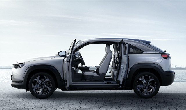 Svojim skraćeni zadnjim vratima bez kvake, koja se otvaraju unazad, kao i zakošenim zadnjim stubovima, MX-30 podseća na kupe vozilo.