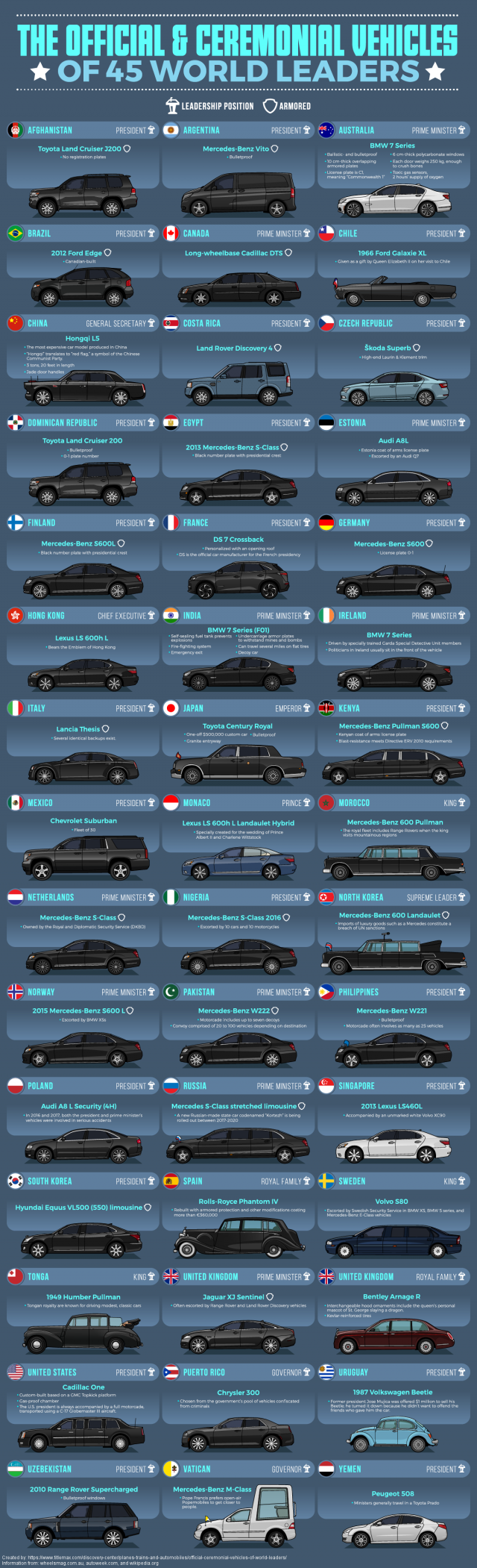 Od zemlje do zemlje razlikuju se potrebe i želje čelnika pa tako se neki voze u standardnim sedanima, drugi u produženim limuzinama, treći u SUV-ovima, četvrti u klasicima, ima i kabrioleta, čak i kombija, ali je priča za sebe bivši predsednik Urugvaja.