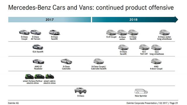 Negde na polovini 2018, Mercedes planira da predstavi novi Sprinter, a kompanija je za drugi deo godine predvidela dve nove varijante SUV-a GLC. Jedna će biti verzija sa pogonom na gorivne ćelije (imala premijeru u Frankfurtu), a druga je GLC sa produženim međuosovinskim rastojanjem.