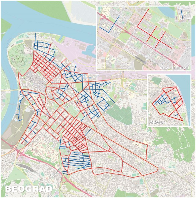 Mapa ulica koje će kontrolisati "Oko sokolovo" (crvenom bojom obeležene su trenutne, a plavom dodatne ulice kretanja)