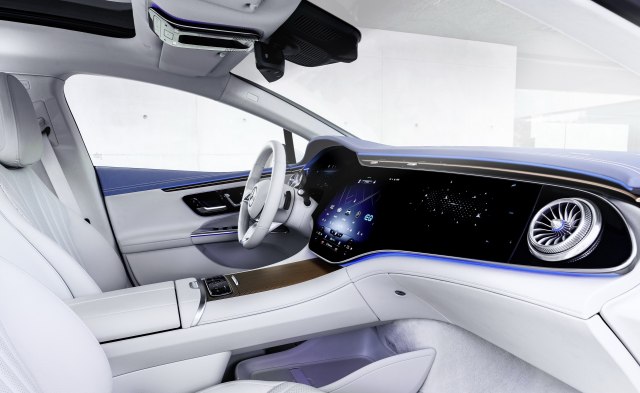 Unutrašnjost je takođe prekopirana iz Mercedesa EQS, tako da kokpitom dominira ogromni MBUX Hyperscreen koji zauzima čitavu komandnu tablu.