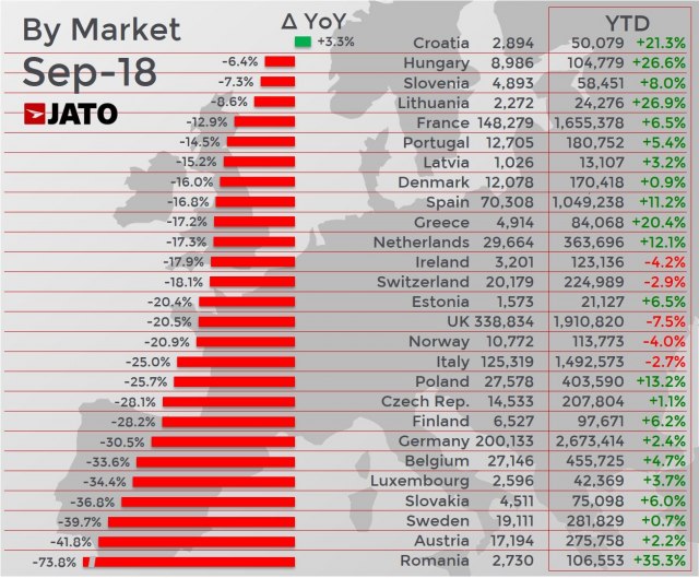 Što se tiče zemalja u okruženju, a u obzir su uzimane samo zemlje Evropske unije, u Hrvatskoj je prodato 2.894 novih automobila u septembru, sličan broj je i u Rumuniji (2.730), dok je Slovenija začajno bolja sa 4.893.