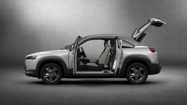 Svojim skraćeni zadnjim vratima bez kvaka, koja se otvaraju unazad, kao i zakošenim zadnjim stubovima, MX-30 podseća na kupe vozilo. Sa druge strane, povišena silueta i plastični zaštitni dodaci na pragovima i lukovima iznad točkova čine da ovaj električni model izgleda kao tipičan krosover.