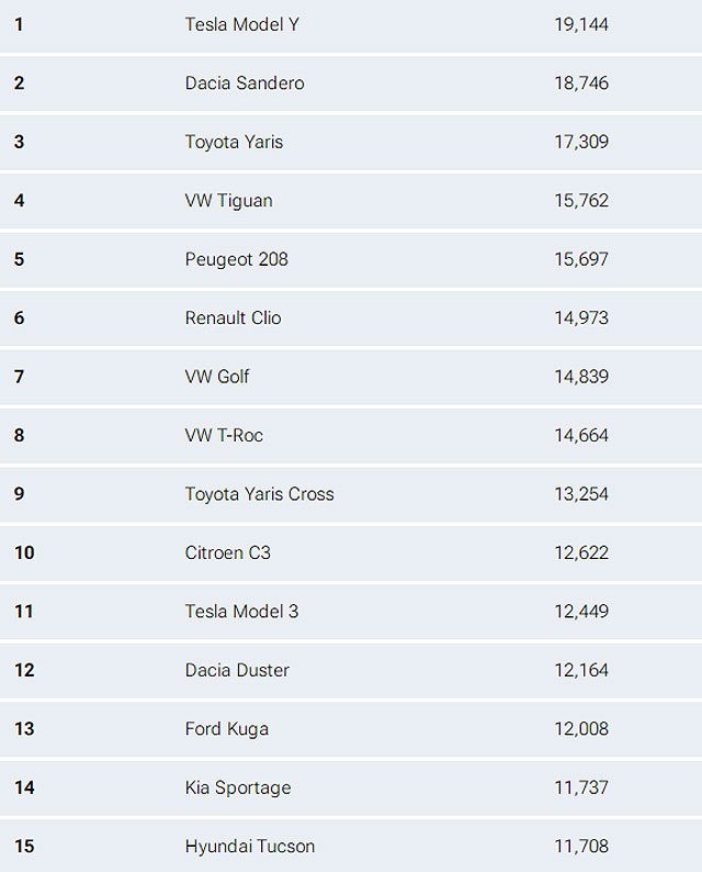 Top-10 najprodavanijih automobila meseca novembra bili su redom: Tesla Model Y, Dacia Sandero, Toyota Yaris, Volkswagen Tiguan, Peugeot 208, Renault Clio, Volkswagen Golf, Volkswagen T-Roc, Toyota Yaris Cross i Citroen C3.