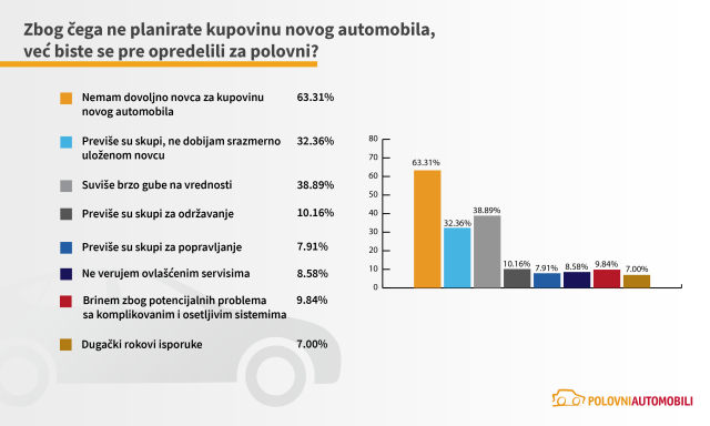 Sa druge strane, oko 57% anketiranih ispitanika ne planira kupovinu novog automobila u budućnosti, već se pre opredeljuje za polovni, te je istraživanje otkrilo i razloge koji stoje iza takve odluke. Izdvajaju se nedostatak finansijskih sredstava za kupovinu novog automobila (63,31%), stav da novo vozilo brže gubi na vrednosti (38,89%), kao i mišljenje da su novi automobili previše skupi i da se ne dobija srazmerno uloženom (32,36%).