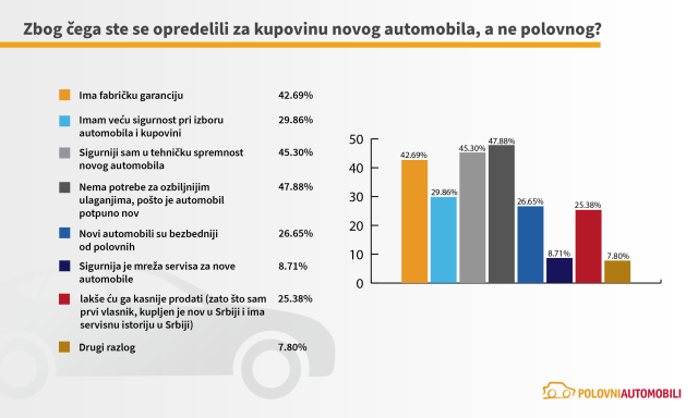 Ispitanici koji planiraju kupovinu novog automobila otkrili su i razloge zbog kojih su se opredelili za novo, a ne polovno vozilo. Najčešće naveden razlog koji je obeležila gotovo polovina ispitanika (47,88%) jeste da pri kupovini novog automobila nema potrebe za dodatnim ozbiljnim ulaganjima. Za nov automobil kupci se odlučuju i zbog sigurnosti u pogledu tehničke ispravnosti novog automobila (45,30%), fabričke garancije (42,69%), sigurnijeg izbora i kupovine (29,86%), veće bezbednosti (26,65%) i lakše kasnije prodaje (25,38%),