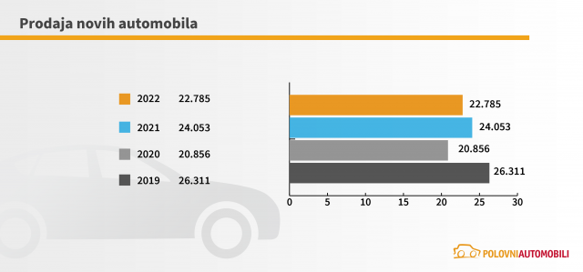 Prema analizi koju je sproveo sajt Polovni automobili, na osnovu podataka prikupljenih u saradnji sa „CUBE Team“-om, tokom 2022. godine prodato je 22.785 novih automobila, što je za 6% manje u odnosu na prodaju ostvarenu tokom 2021. godine.