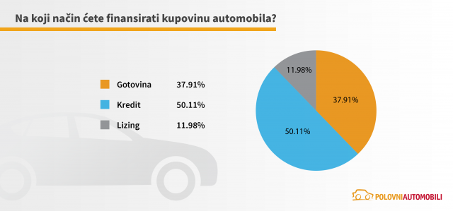 Anketom je istraženo i kakvi su planovi kupaca u pogledu načina finansiranja automobila. Polovina anketiranih kupaca koji planiraju da kupe novi automobil opredeliće se za kupovinu na kredit, 38% njih za gotovinu, a svega 12% planira kupovinu putem lizinga.