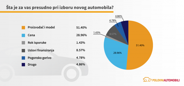 Iako je nov automobil do sada kupilo svega 23% ispitanika obuhvaćenih anketom sajta Polovni automobili, čak 43% njih planira da to učini u budućnosti. U okviru ankete ispitanici koji planiraju kupovinu novog automobila naveli su šta im je presudno pri izboru. Više od polovine njih (51,40%) navelo je da su proizvođač i model automobila najvažniji, dok je za 29% njih presudna cena. Kao značajni faktori pri izboru novog automobila dalje se navode uslovi finansiranja (8,57%) i pogonsko gorivo (4,78%).