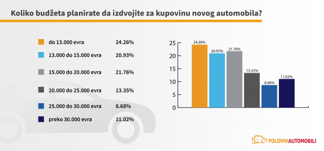 Kada je reč o budžetu koji se odvaja za kupovinu novog automobila, dobijeni podaci pokazuju da najveći broj ispitanika planira kupovinu automobila u okviru nešto manjih cenovnih rangova. Shodno tome, gotovo četvrtina ispitanika (24,26%) planira da izdvoji do 13.000 EUR, a sledi cenovni rang od 15.000 do 20.000 EUR (21,76%), te zatim od 13.000 do 15.000 EUR (20,93%).