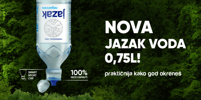 Praktična flaša zapremine 0,75l sa novim Smart Sport čepom ergonomski je zamišljena da bude laka za upotrebu u svakoj prilici, te je pogodna za aktuelne letnje avanture, kada se odlučite da se upustite u vikend izlet, planinarenje ili duge šetnje. Nova Jazak flaša je zahvalan partner jer ne zauzima mnogo mesta u prtljagu. Inovativna tehnologija novog čepa, prvog takvog na našem tržištu, osmišljena je sa ciljem da obezbedi sigurnost kako se voda u bilo kom položaju ili pokretu ne bi mogla prosuti iz flaše. Bilo da je u rukama, rancu, torbi ili na zadnjem sedištu automobila, voda neće oštetiti vaše stvari. Svaka kap fruškogorskog bisera ostaje sačuvana, a vaša idealna doza vode od 0,75L za dnevne aktivnosti osigurava hidrataciju u svakom trenutku.