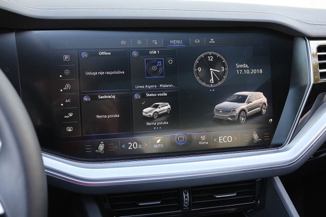 Ono što prvo pada u oči prilikom ulaska u Touareg su ogromni displeji. Sa dijagonalom od 15 inča, centralni displej je trenutno najveći horizontalni ekran u automobilima. Rezolucija je veoma visoka, sa vrlo izraženim kontrastom.