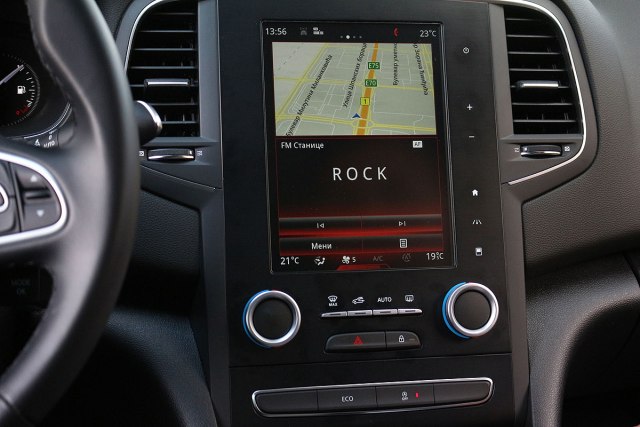 Standard u najskupljem paketu opreme "intens" je ekran dijagonale od 7 inča, a u testiranom automobilu je verzija od 8,7 inča koja se dobija uz doplaćeni "r-link 2" multimedijalni sistem. Preko njega se reguliše ne samo rad audio sistema i navigacije, već i klima uređaja.
