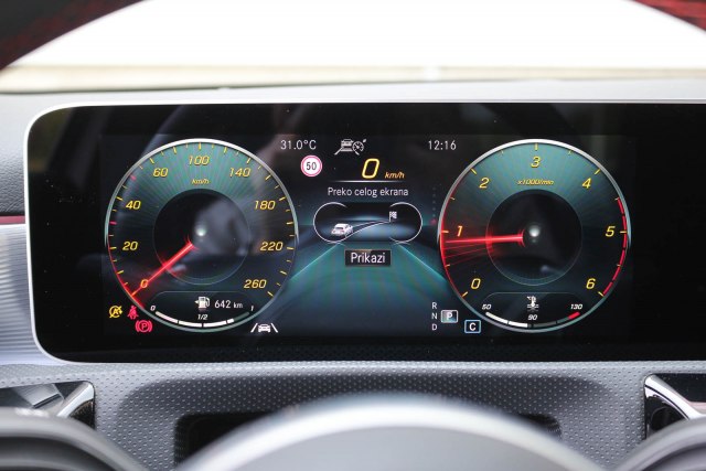 U kabini nas čeka iznenađenje: sve u šta gledamo smo već videli, ali na daleko većim i skupljim modelima. Toliko opreme nismo očekivali u "startnom" modelu Mercedesa koji očigledno ima tolike ambicije da je dobar deo tehničkih i bezbednosnih sistema preuzeo od S-klase.