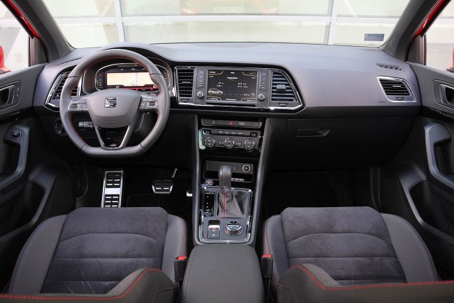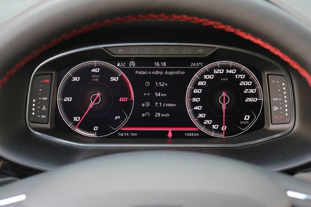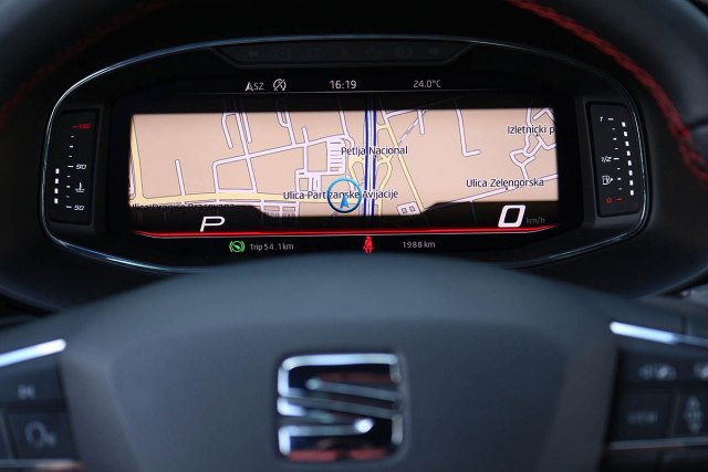 Ono što svakako privlači veliku pažnju u sportskom enterijeru Atece FR jesu digitalni instrumenti. U ponudi je nekoliko opcija prikaza, od toga da se mapa navigacije vidi preko celog ekrana, do prikaza sportskih instrumenata.