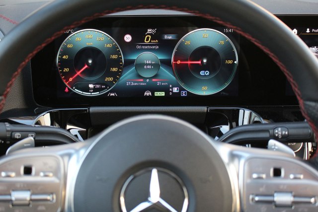 Međutim, Mercedes ima slatku tajnu – komande menjača iza volana. Ovde, naravno, nema promene brzina, već je njihova funkcija da menjaju nivo rekuperacije. Jedan klik na minus dovodi do snažne rekuperacije, takve da možete praktično da vozite samo uz pomoć pedale gasa.