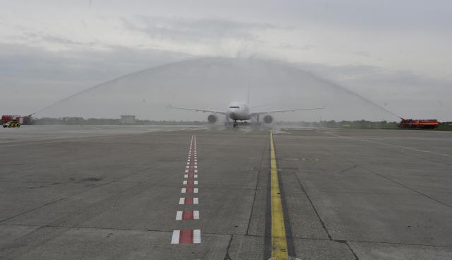 Avion je svečano dočekan tradicionalnim pozdravom vodenim topovima.