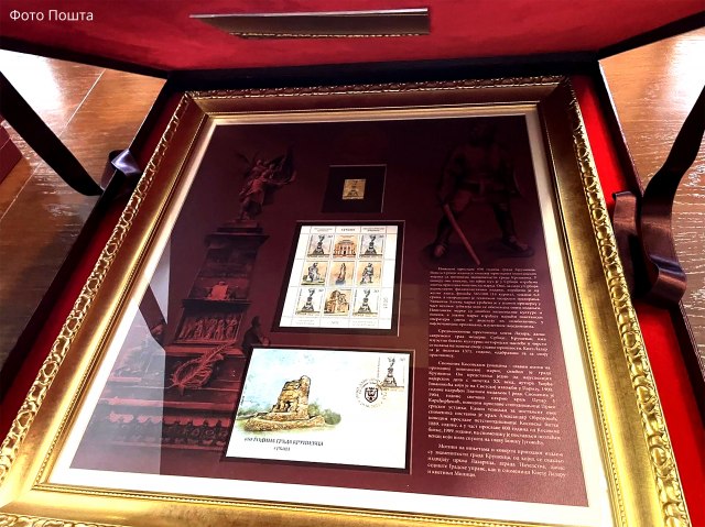 Zlatna poštanska marka Pošte Srbije predstavlja simbol Grada Kruševca - spomenik kosovskim junacima, a izrađena je tehnikom laserskog graviranja od žutog zlata.