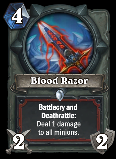 Služiće odlično za čišćenje tabli agresivnih špilova i u osnovi na Blood Razor možemo gledati kao na dva puta mini Swipe (3 damage jednom minionu i 1 damage svim ostalim). Osim toga, Warrior ima mali milion karata koje su uvek profitirale od Whirlwind efekata: Execute, Sleep with the Fishes, Armorsmith, Battle Rage, Frothing Berserker, Bloodhoof Brave, Grommash Hellscream… Sve su ovo karte koje su u raznim Warrior špilovima i te kako igrane i koje znatno podižu vrednost ovom oružju.