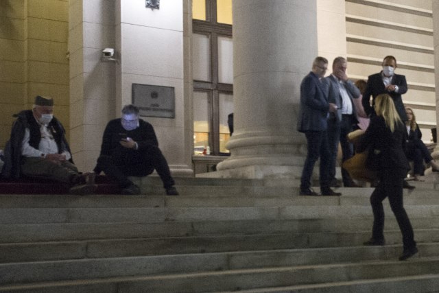 Za razlliku od njega, poslanici SNS prenoćili su na ispred. Martinović i Božić su sve vreme bili na stepeništu, a veći deo noći ispred je bio i samostalni poslanik Miladin Ševarlić, prenosi Tanjug, koji je povremeno, na neko vreme ulazio u zgradu, ali se vraćao na stepenište.