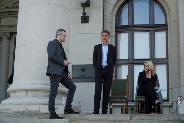 Lider Dveri Boško Obradović prespavao je u Skupštini Srbije, dok su jutro ispred parlamenta dočekali poslanici SNS Aleksandar Martinović i Sandra Božić.