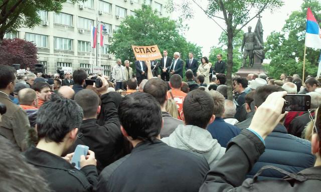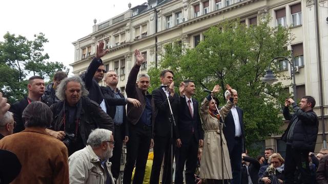 Na improvizovanoj bini su bili predsednik DS Bojan Pajtić, lideri Dveri i DSS Boško Obradović i Sanda Rašković Ivić, lider pokreta Dosta je bilo Saša Radulović, ali i predsednici SDS i LDP Boris Tadić i Čedomir Jovanović, kojih nije bilo juče u sedištu DSS na zajedničkom obraćanju opozicije.