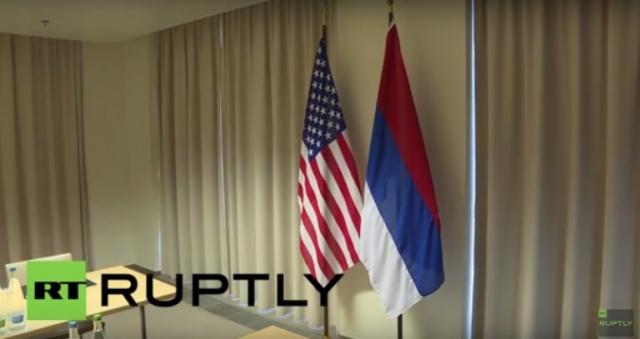 Dok je jedan od zamenika državnog sekretara SAD Glen Džonson vodio novinare pre nego što su diplomatski timovi došli, jedan od snimatelja ga je upozorio na očiglednu grešku.