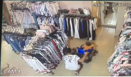 Na snimku se vidi kako žena odvaja komad odeće i spušta ga na pod, potom odlazi na drugi kraj butika, a mladić sa detetom uzima taj komad i stavlja ga u torbu prikačenu za kolica.