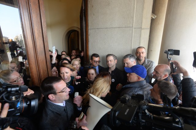 Ispred zgrade Skupštine grada metež. Lideri SzS pokušali da uđu u zgradu, ali su sprečeni. Gužva ispred ulaza i vređanje. Jednoj ženi pozlilo.