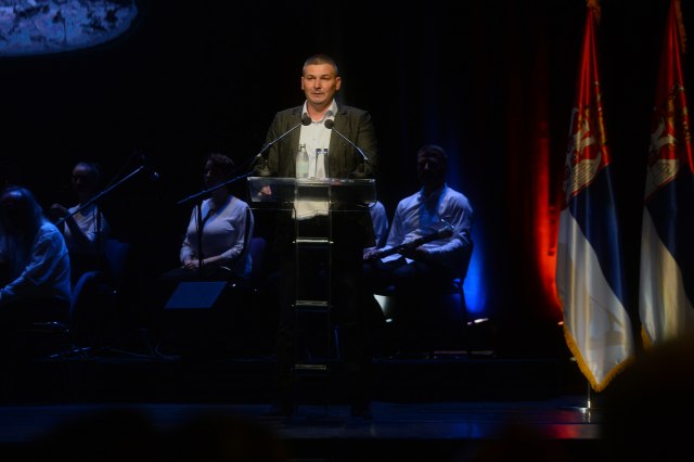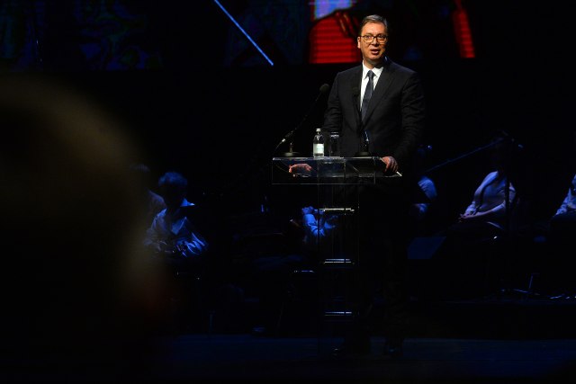 Dolazak predsednika Vučića propraćen je iz publike uzvicima "Aco, Srbine" i aplauzom, a svečanost je počela intoniranjem himne Bože pravde.