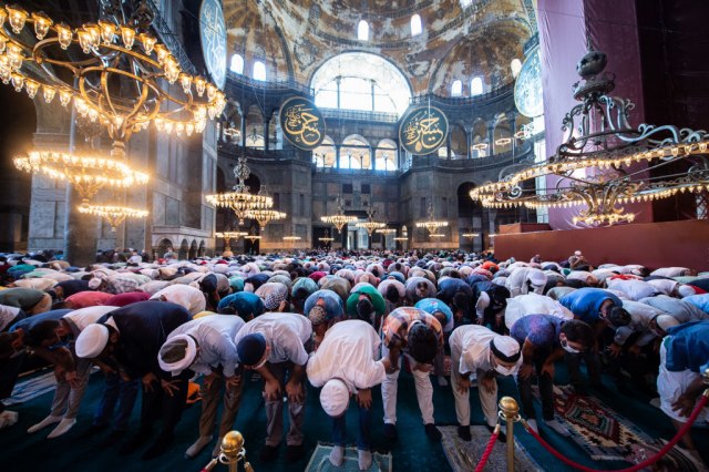 Nekoliko hiljada muslimana na čelu s predsednikom Turske, Redžepom Tajipom Erdoganom, u petak je bilo na prvoj molitvi u Aja Sofiji koja je na samom početku svoje istorije duže od milenijuma, bila vizantijska crkva.
