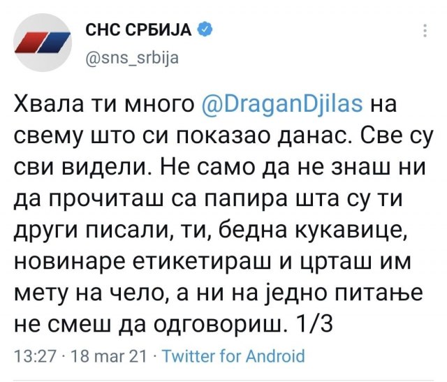 "Hvala ti mnogo @DraganDjilas na svemu što si pokazao danas. Sve su svi videli. Ne samo da ne znaš ni da pročitaš sa papira šta su ti drugi pisali, ti, bedna kukavice, novinare etiketiraš i crtaš im metu na čelo, a ni na jedno pitanje ne smeš da odgovoriš", počela je na Tviteru svoje obraćanje Đilasu.