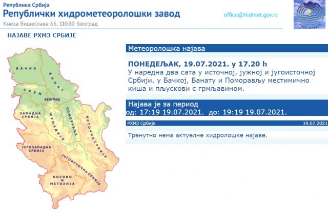 "U naredna dva sata u istočnoj, južnoj i jugoistočnoj Srbiji, u Bačkoj, Banatu i Pomoravlju mestimično kiša i pljuskovi s grmljavinom", navodi se u upozorenju.